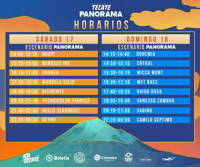 Han sidos confirmados los horarios del Festival Panorama a realizarse en Orizaba este fin de semana. El sábado 17 de agosto la banda Noup! iniciará las actividades a partir de las 14:45 hrs., le seguirá Mimosas Inc, Andreu, Marcela Viejo, Disidente, Technicolor Fabrics y finalmente Hello Seahorse! y Reyno cerrarán actividades, mientras que el domingo 18 la banda Bohemia abrirá el escenario Panorama a las 14:15 hrs., posteriormente se presentará Cntral, Micca Mont, Wet Baes, Ruido Rosa, Vanessa Zamora y finalmente cerrarán Sabino y Camilo Séptimo
